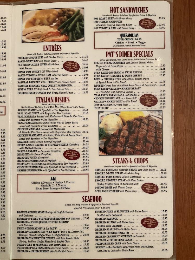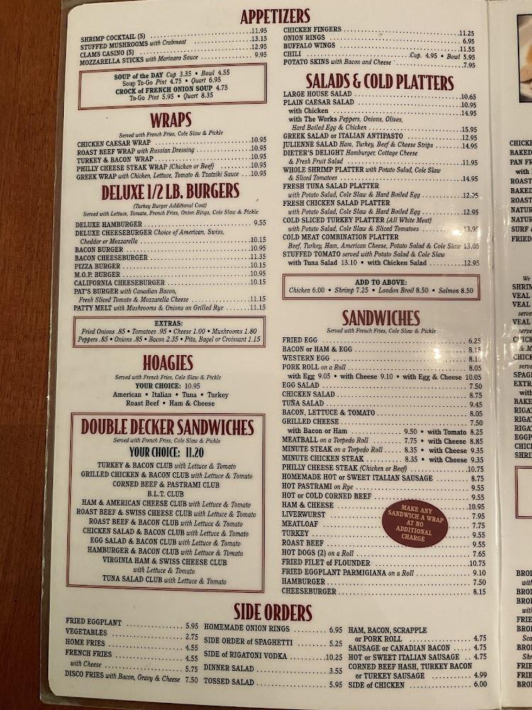 Pat's Diner features a diverse menu filled with classic American dishes. Breakfast items include omelettes, pancakes, and numerous sides. The lunchtime selection boasts sandwiches and burgers. The diner excels with homemade desserts for a sweet finish.